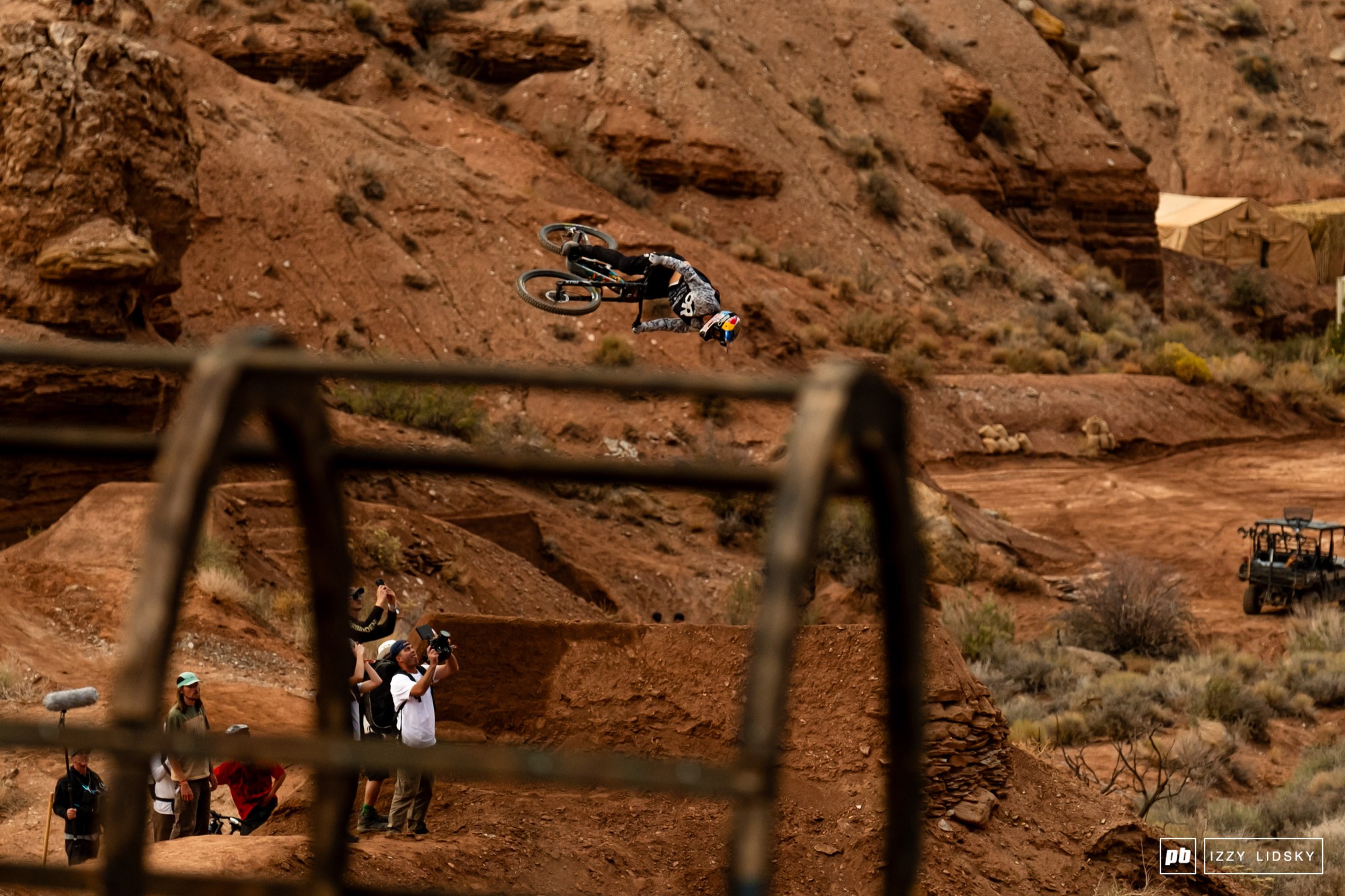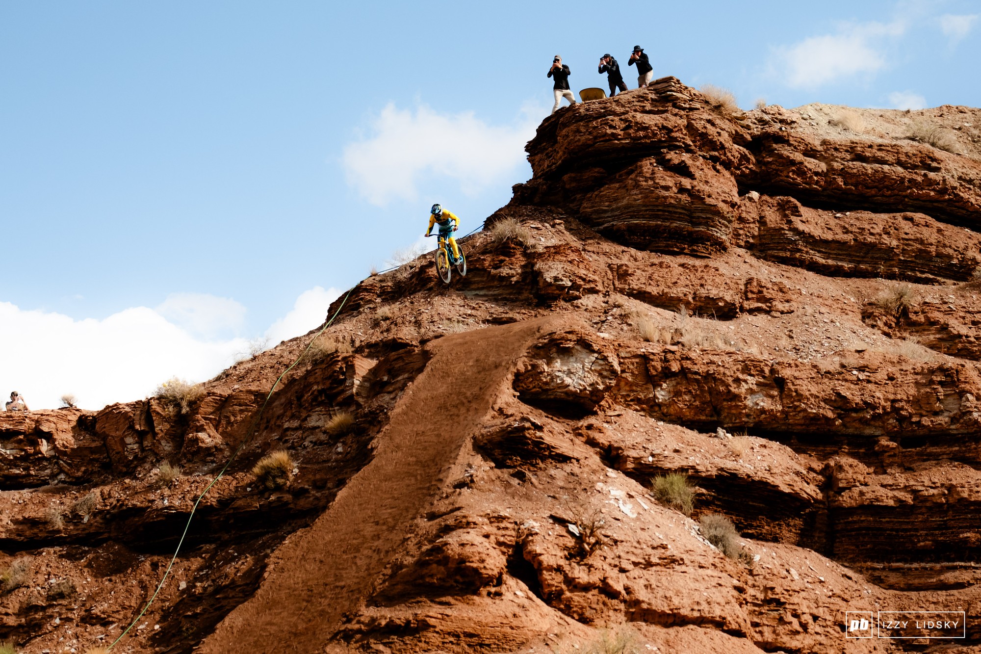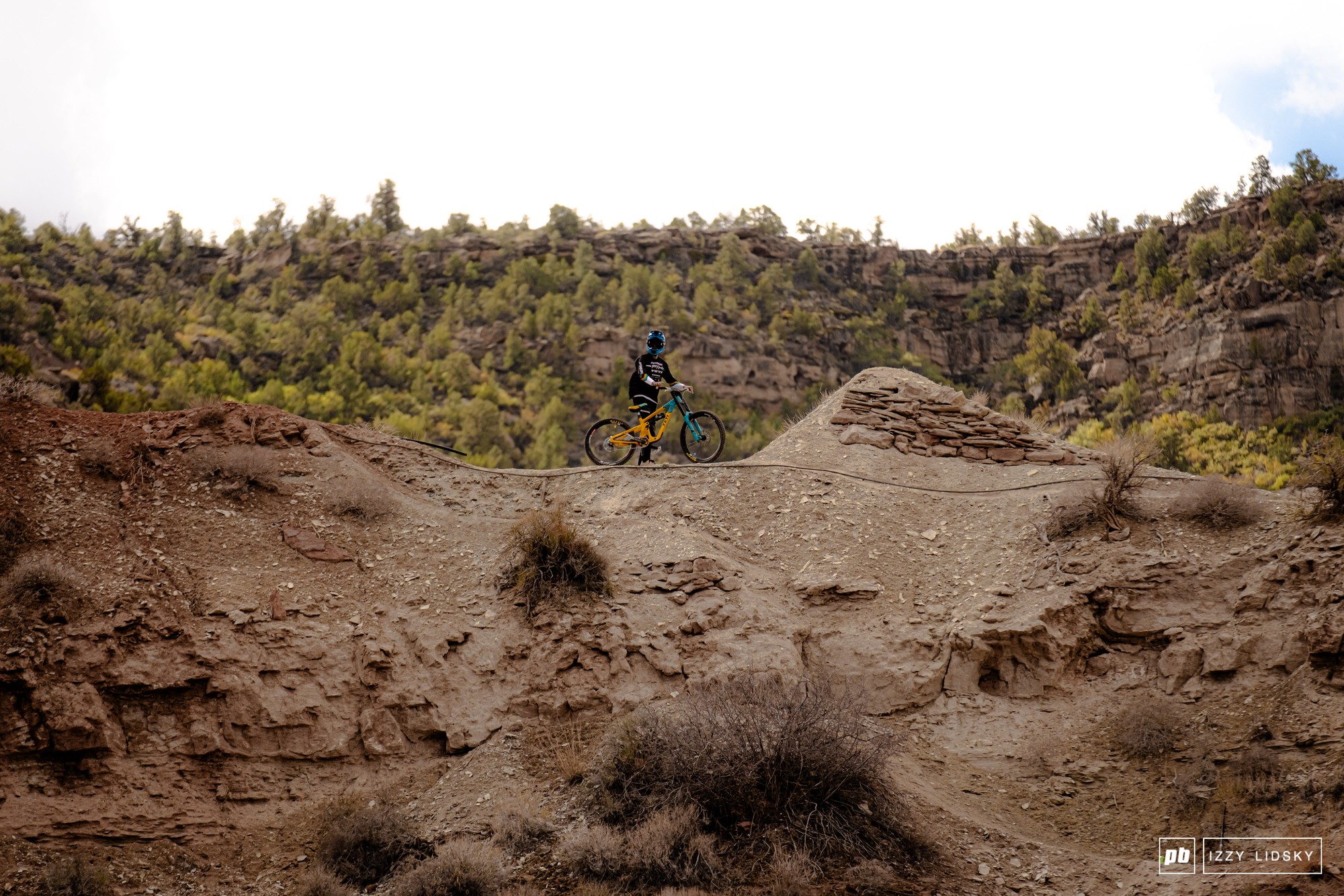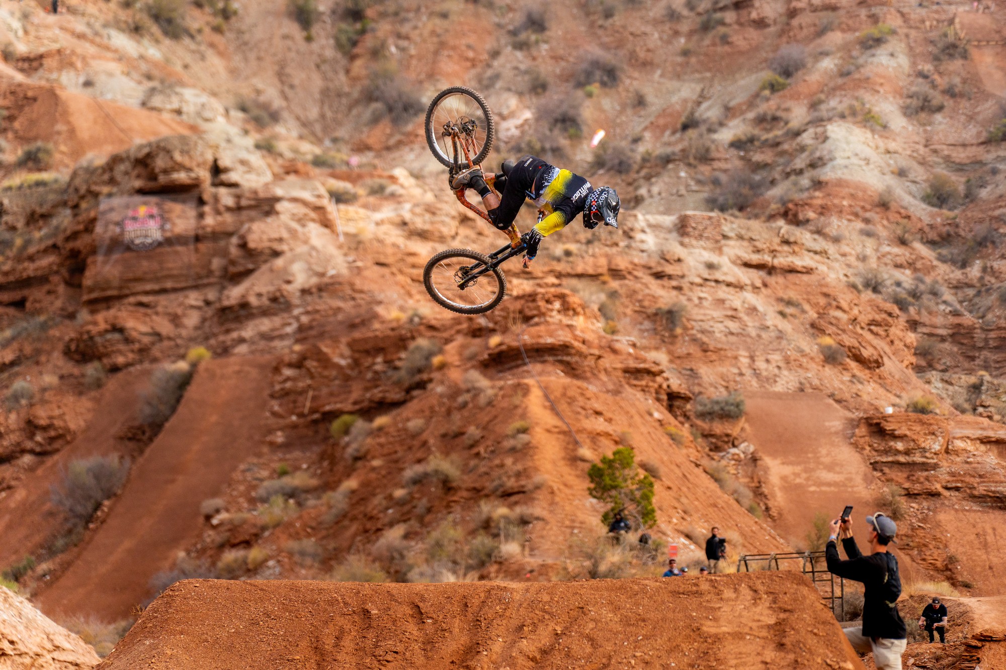 Адольф Сильва первым прыгнул этот дроп. Экип и байк в фирменных цветах Yeti.