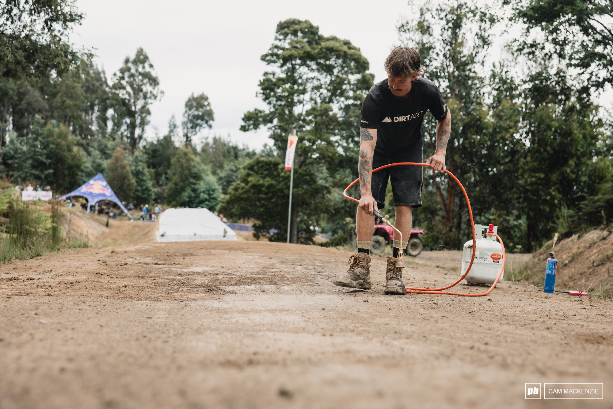 Ко времени предполагаемых стартов всё было настолько плохо, что на финальные здоровенные гэпы у участников просто не хватало ходов. Участки в нижнем лесу, которые до этого были разбиты в пыль, стали превращаться в липучую глину, забивающую колёса. А на скоростном участке в середине трассы было банально опасно поворачивать из-за не иллюзорного шанса срыва обеих колёс. Перед запланированным стартом в нескольких местах трассу старались сушить газовыми горелками и нескольким участникам даже удалось её частично спустить, но потом снова пошёл дождь и гонку решили отменить с точки зрения безопасности. Кажется, из спортсменов таким решением не остался недоволен никто.