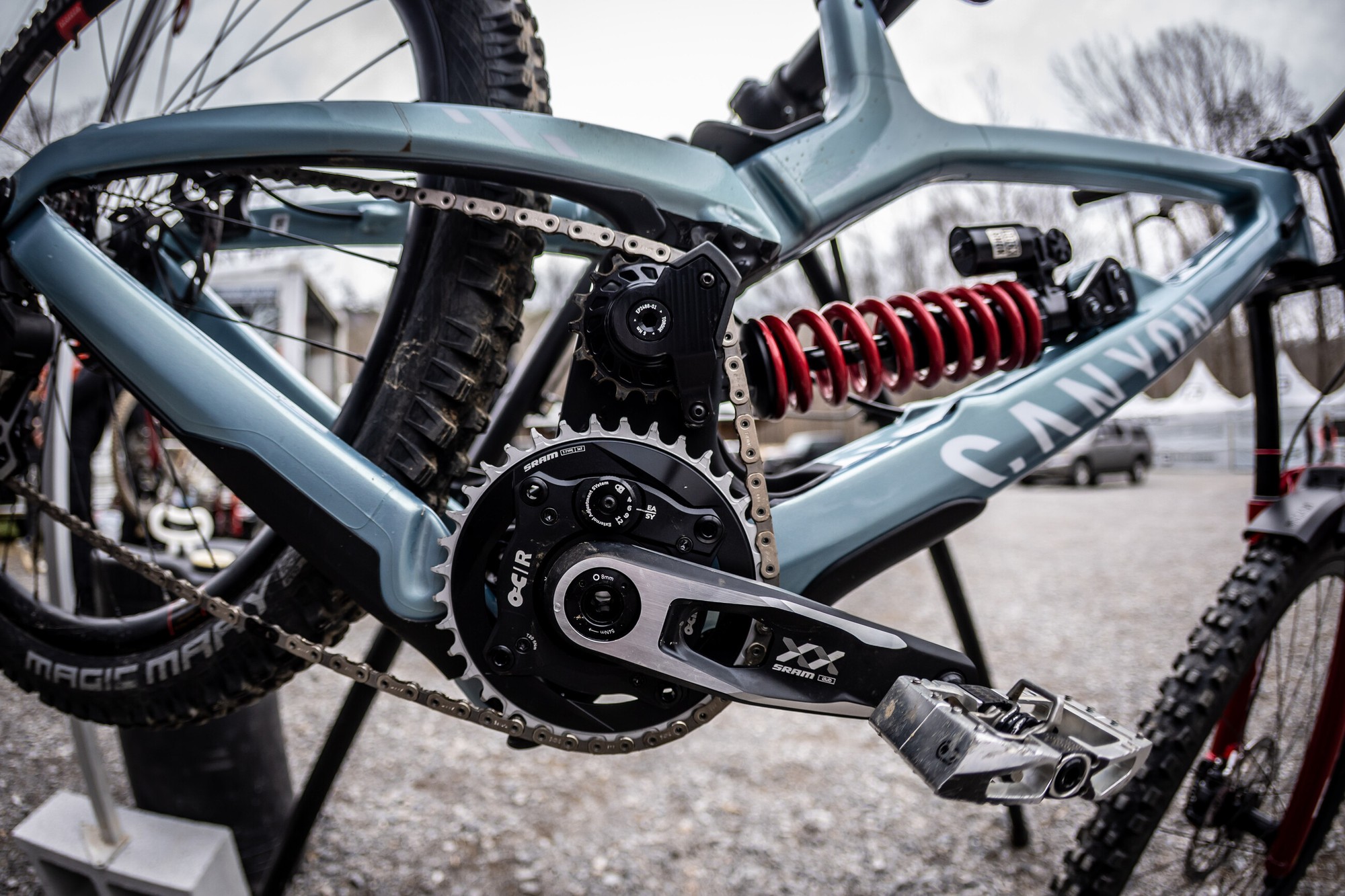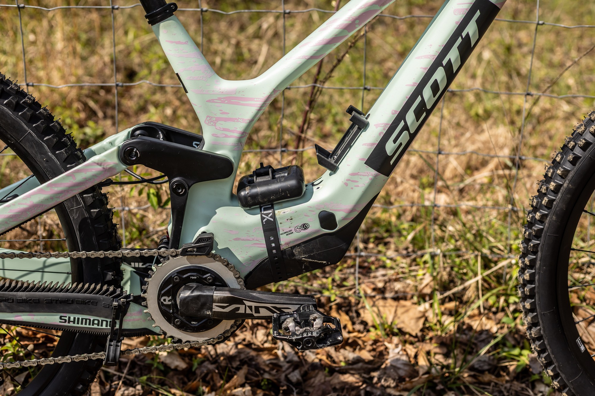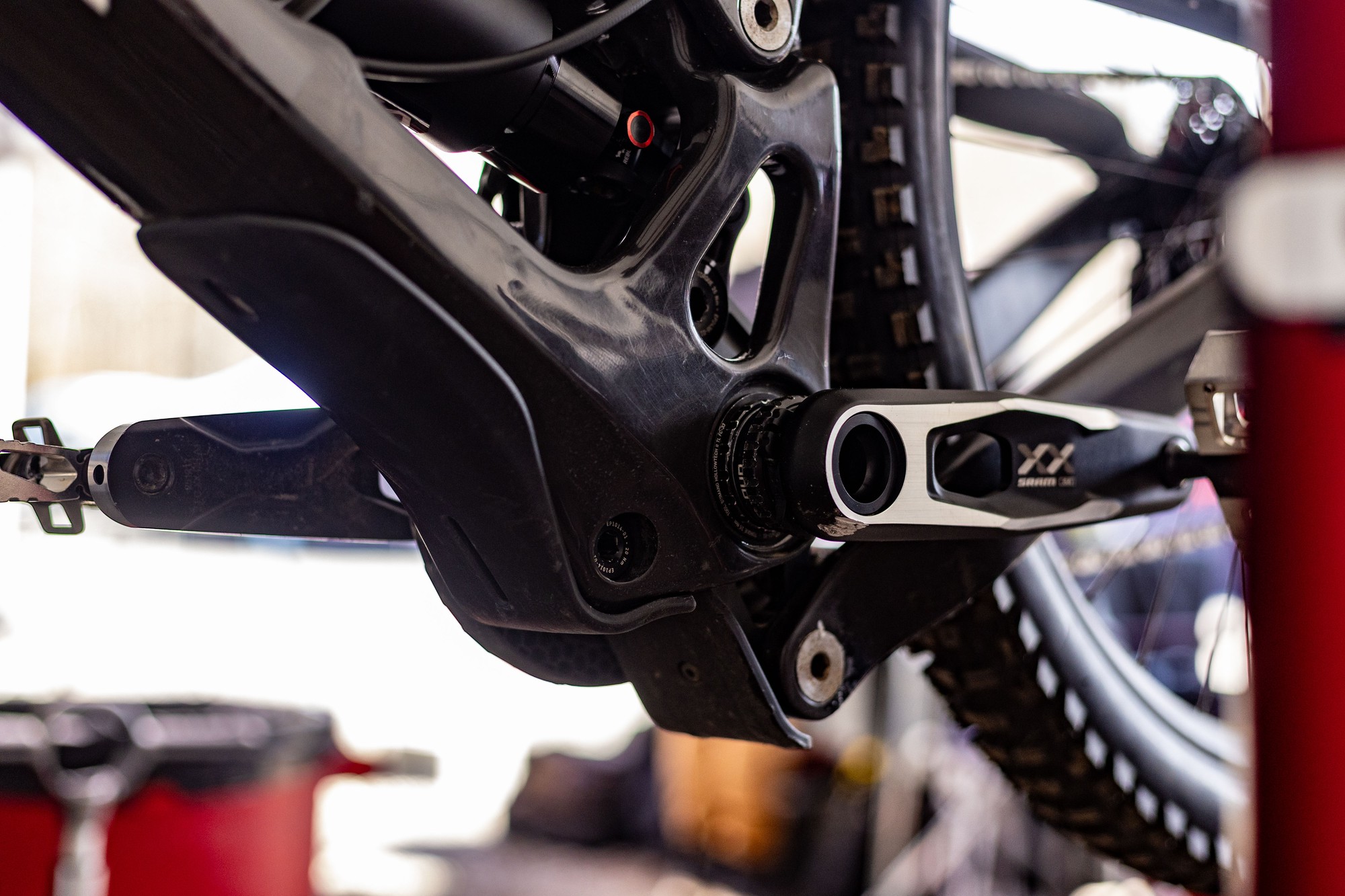 Обратите внимание на шатуны Saint. Ось почему-то заклеена изолентой. Обычно там просто отверстие, так как в текущей версии шатунов ось просто запрессовывается в шатун. Возможно здесь есть болт и это новая версия Saint под крепление звезды Direct Mount.