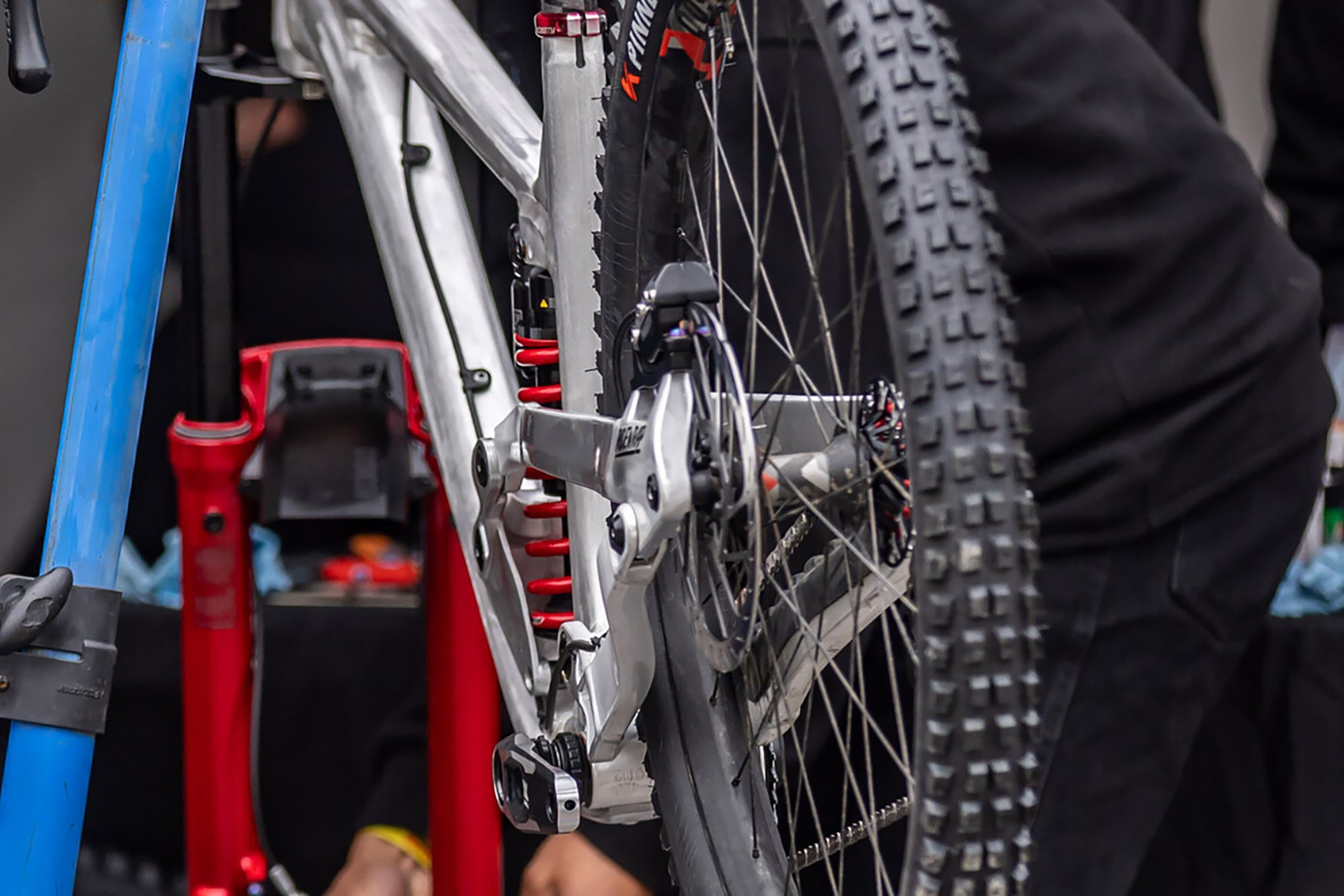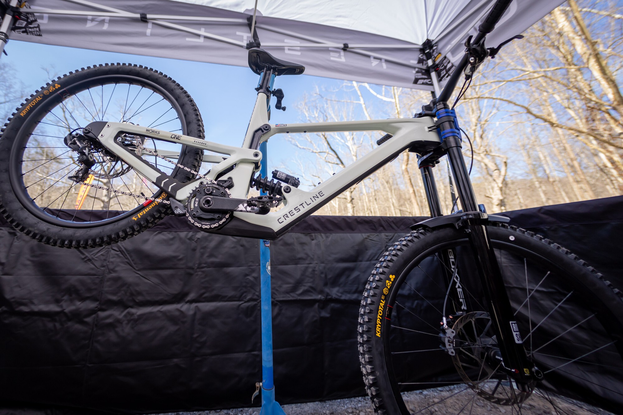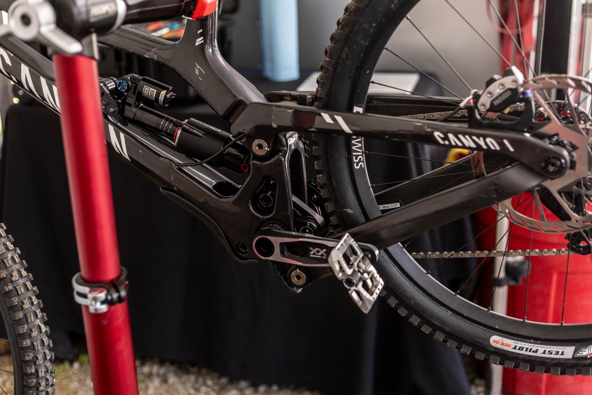 Вверху — прототип нового даунхилльного байка от Ari Bikes, который мы видели ещё зимой. Теперь у нас реальные фото, а не скриншоты из видео, так что детали можно рассмотреть получше, хотя неопреновый чехол всё же прикрывает самую интересную часть байка — подвеску. В креплении верхних перьев к нижним явно есть флип-чип. Также есть одно фото без чехла с байком Тигана Круза, которое удалось сделать во время его сборки.