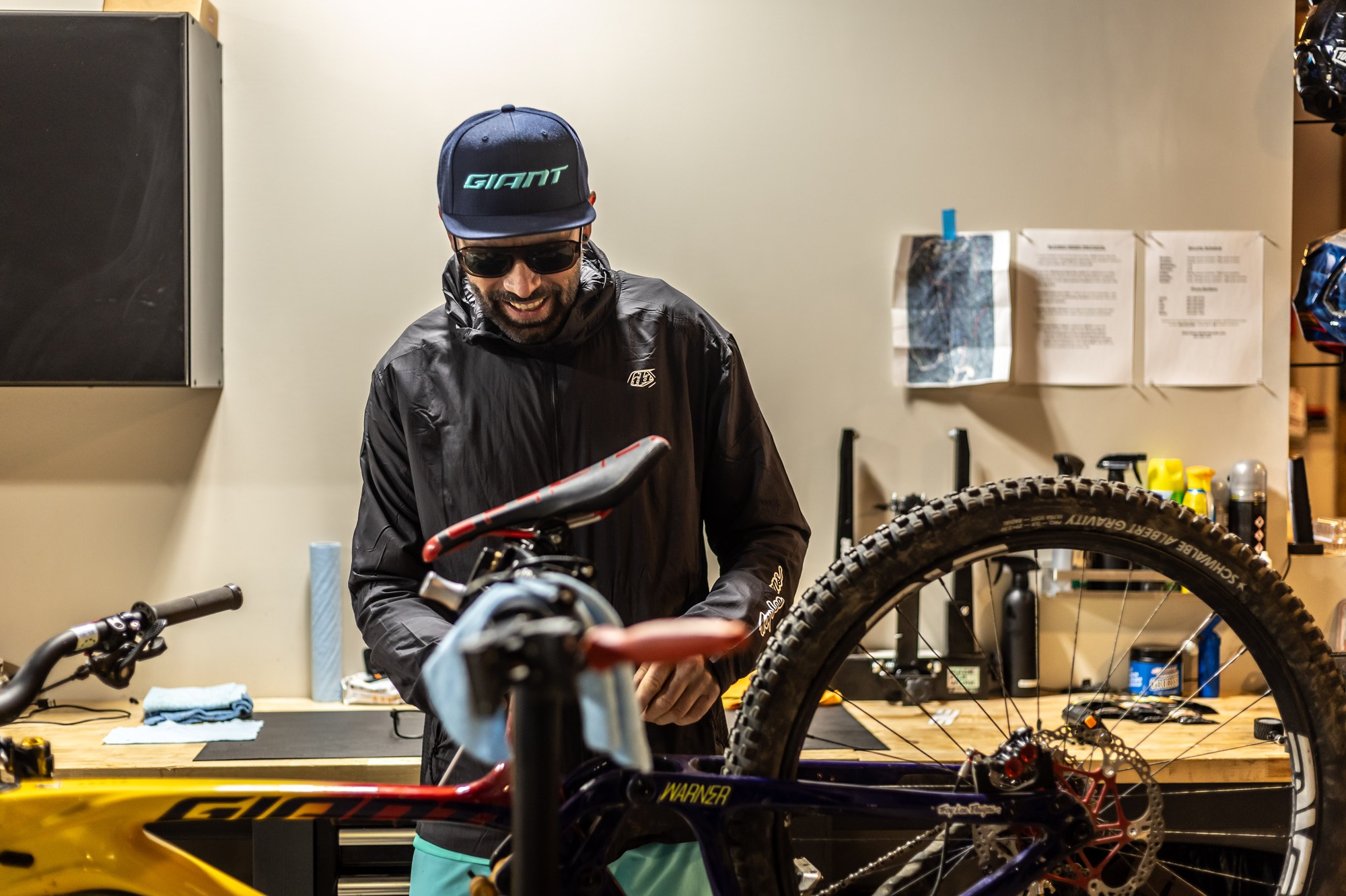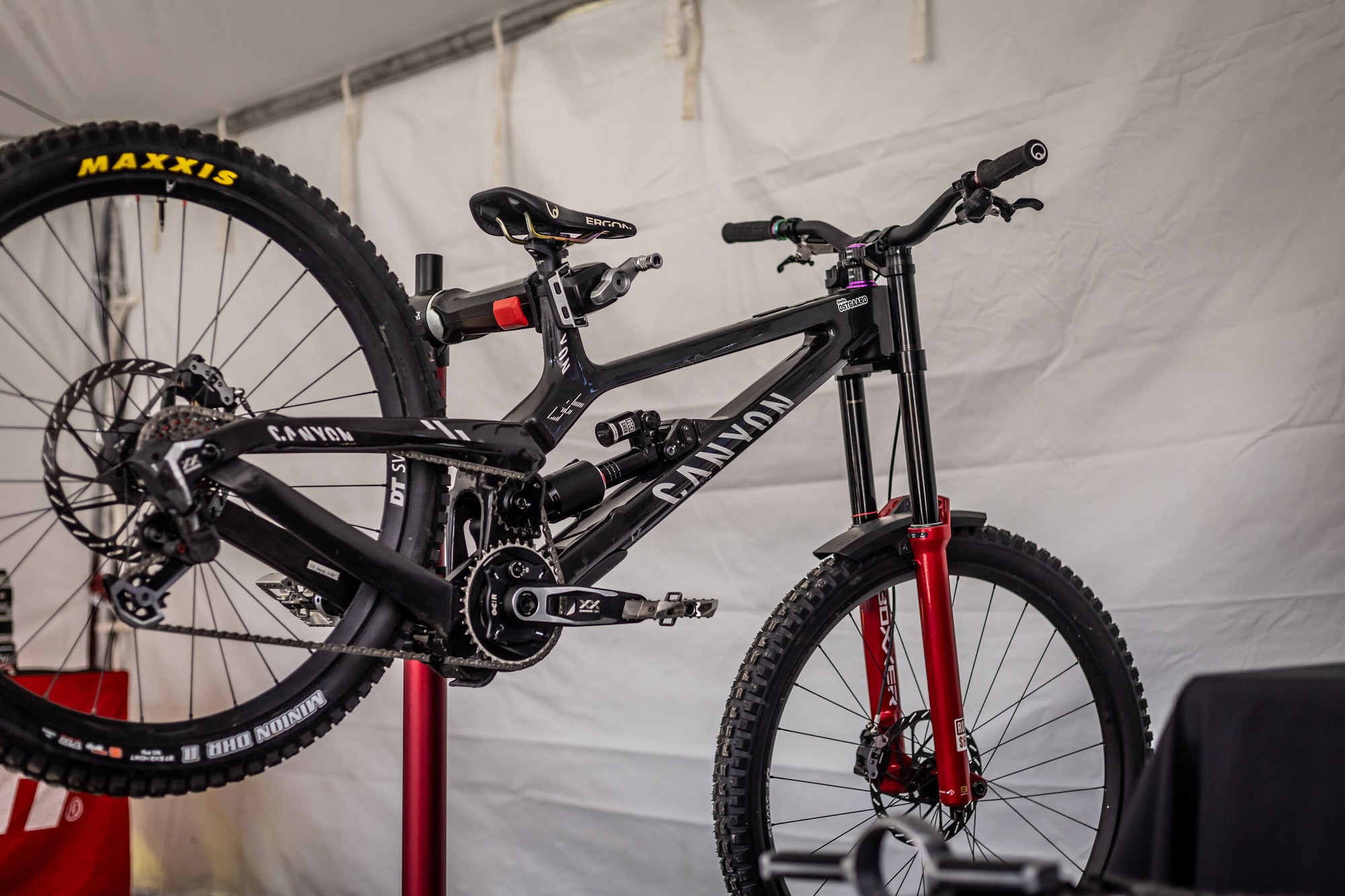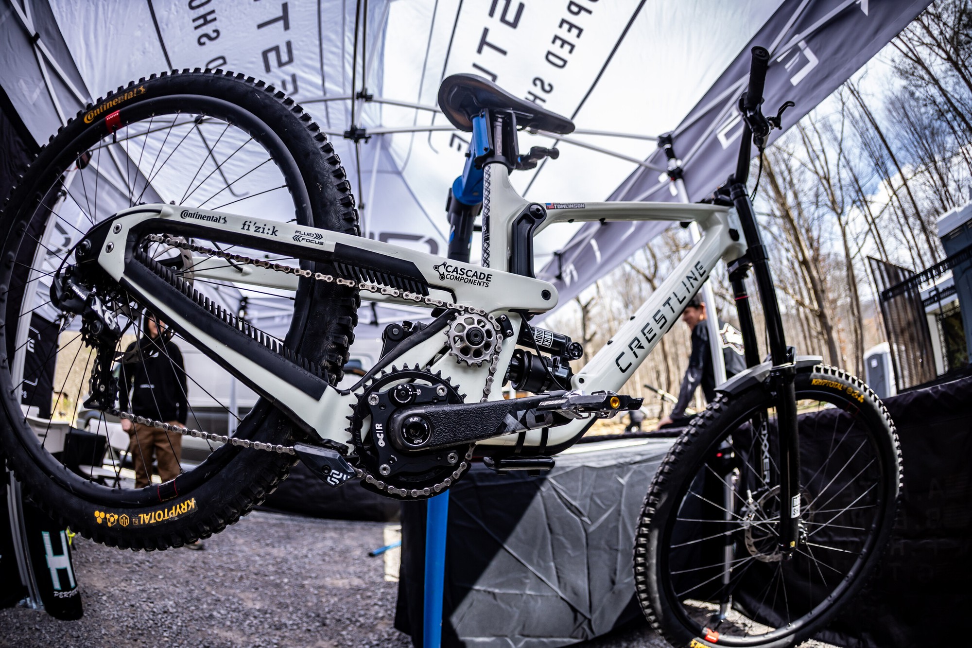 Вверху — прототип нового даунхилльного байка от Ari Bikes, который мы видели ещё зимой. Теперь у нас реальные фото, а не скриншоты из видео, так что детали можно рассмотреть получше, хотя неопреновый чехол всё же прикрывает самую интересную часть байка — подвеску. В креплении верхних перьев к нижним явно есть флип-чип. Также есть одно фото без чехла с байком Тигана Круза, которое удалось сделать во время его сборки.
