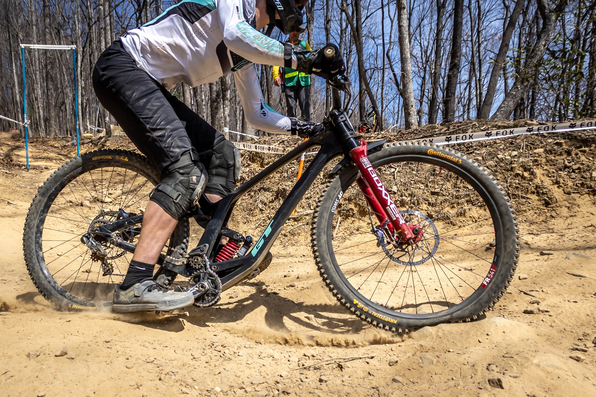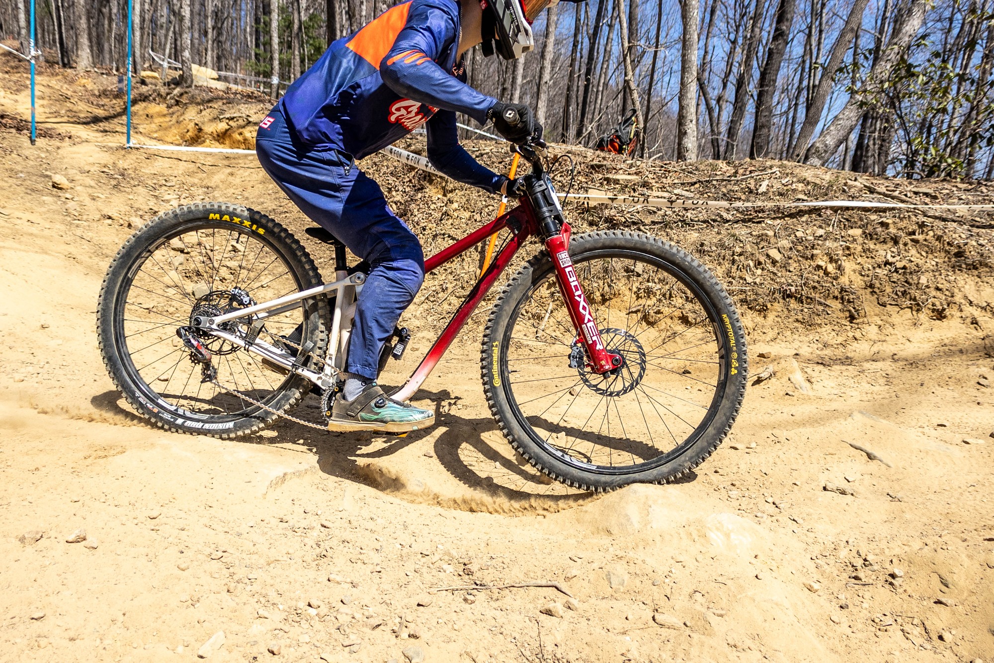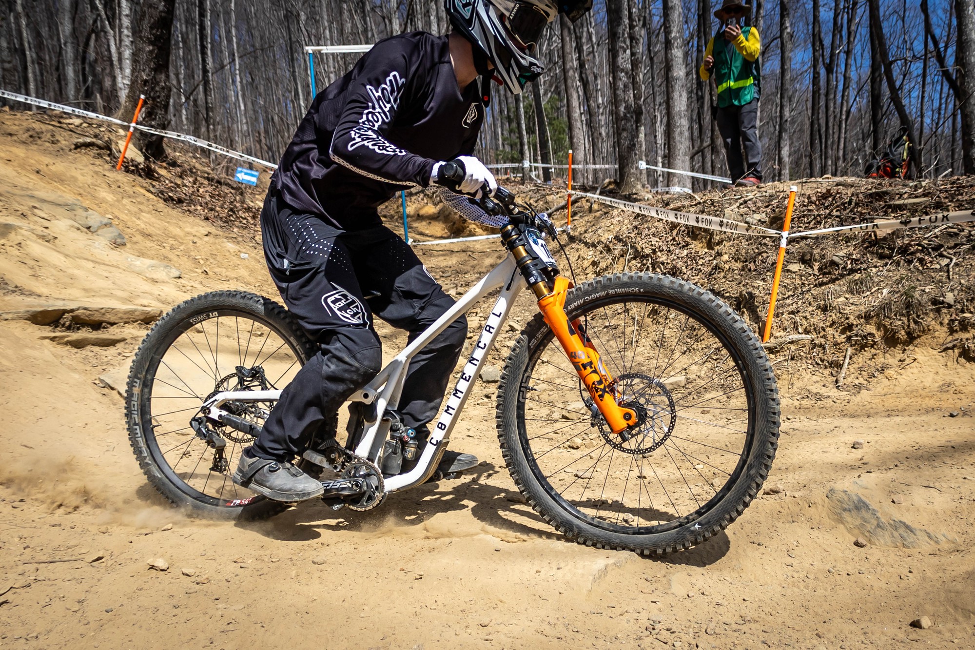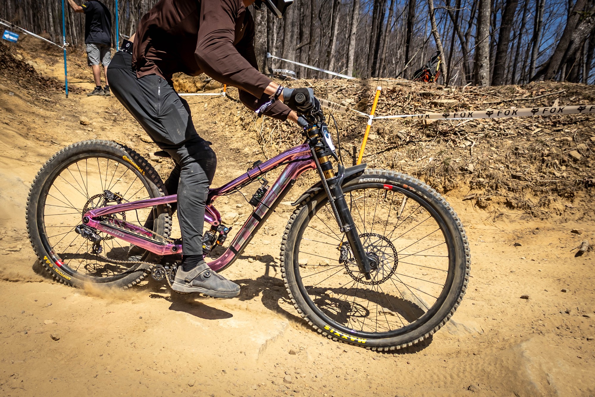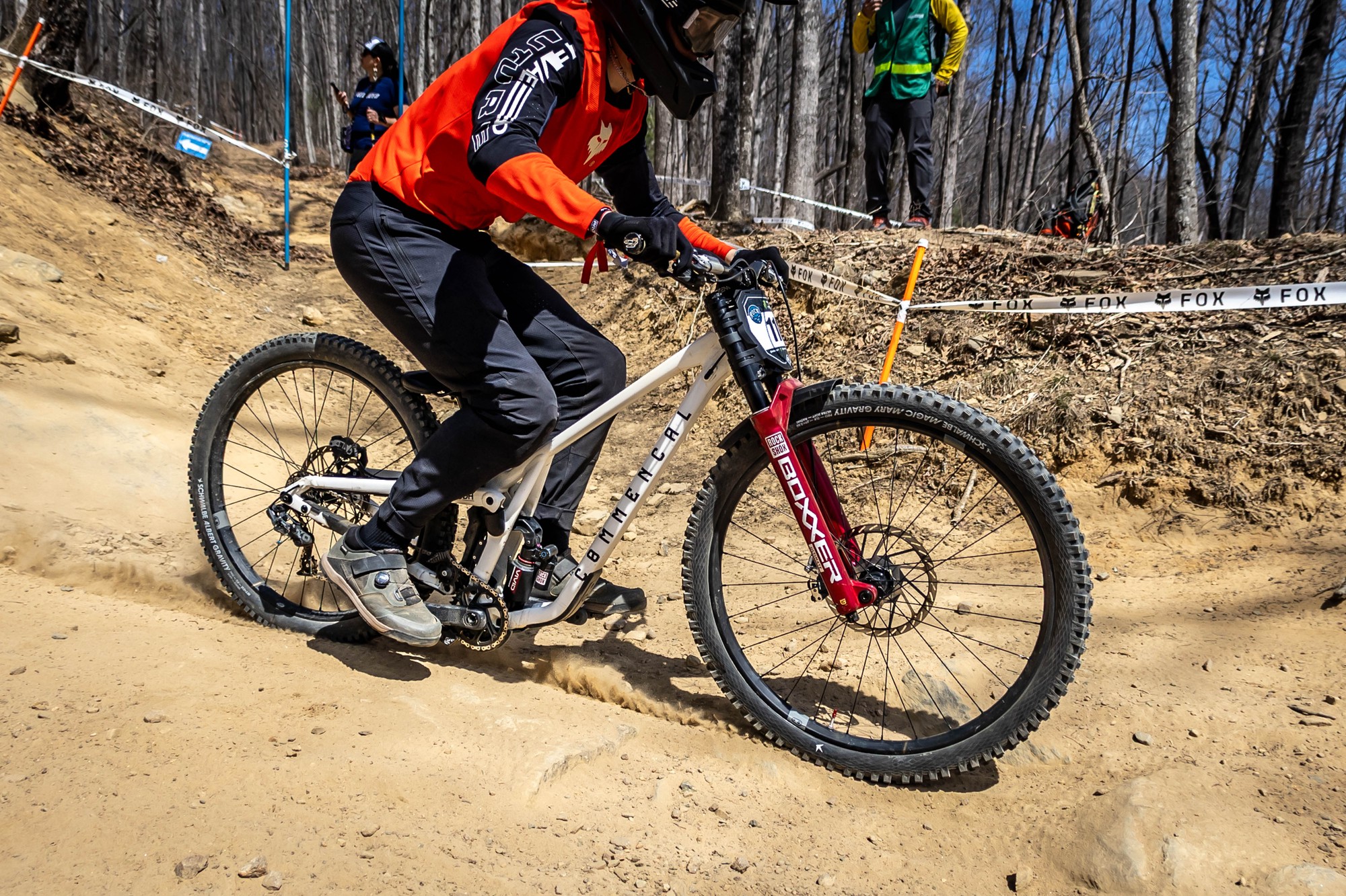 Ещё один Commencal Supreme DH V5. Раз было уплачено за Öhlins, значит и использовать её нужно на все деньги. Пожалуй, лучшее фото встречи переднего колеса с этим камнем за всю подборку.