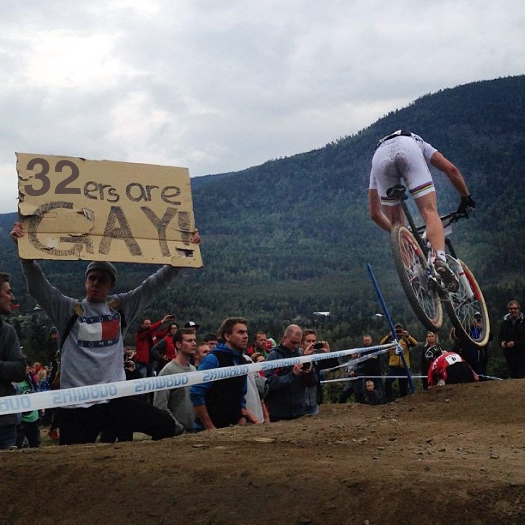 В эпоху появления 29 было ровно также и следующее в тексте впечатление о катимости и держаке, жесткости и управляемости в сравнении с первыми найнерами совершенно предсказуемо. История делает круг и когда производители рам начнут делать раму «вокруг» райдера и его хотелок — вопросов к перспективе 32" будет намного меньше. А пока — лишь «интересненько», не более. Особенно в части появления нового плакатика от недовольного новыми колесами зрителя на гоночной трассе (помните такой?) )))